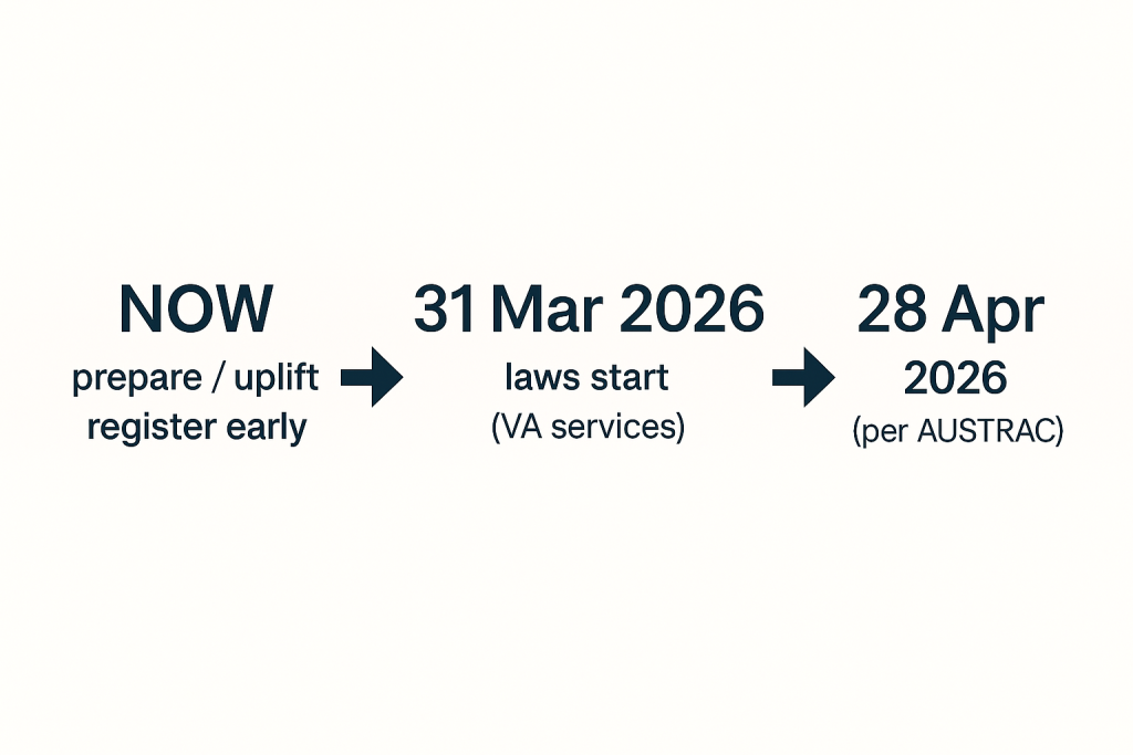 By 31 March 2026AUSTRAC indicates you must be registered before providing registrable virtual asset services (and you must not provide them until registration is confirmed)Businesses in-scope for registrable VA services